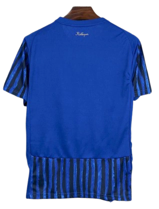 Com fundo em azul royal e faixas em azul-marinho, a camisa apresenta acabamentos em dourado nos logos da Puma e do escudo do clube. Na parte de trás da gola, a assinatura discreta da KidSuper reforça o toque exclusivo e artístico do modelo.